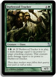 1G, T If Durkwood Tracker is in play, it deals damage equal to its power to target attacking creature. That creature deals damage equal to its power to Durkwood Tracker.