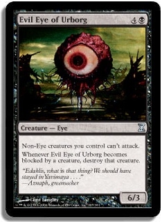Non-Eye creatures you control can't attack. Whenever Evil Eye of Urborg becomes blocked by a creature, destroy that creature.