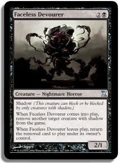 Shadow (This creature can block or be blocked by only creatures with shadow.) When Faceless Devourer comes into play, remove another target creature with shadow from the game. When Faceless Devourer leaves play, return the removed card to play under its owner's control.