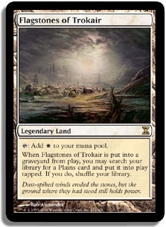 T Add W to your mana pool. When Flagstones of Trokair is put into a graveyard from play, you may search your library for a Plains card and put it into play tapped. If you do, shuffle your library.