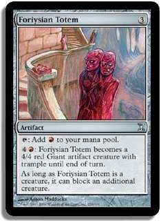 T Add R to your mana pool. 4R: Foriysian Totem becomes a 4/4 red Giant artifact creature with trample until end of turn. As long as Foriysian Totem is a creature, it can block an additional creature.