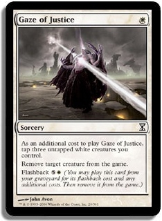 As an additional cost to play Gaze of Justice, tap three untapped white creatures you control. Remove target creature from the game. Flashback 5W (You may play this card from your graveyard for its flashback cost and any additional costs. Then remove it from the game.)