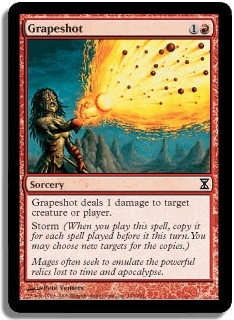 Grapeshot deals 1 damage to target creature or player. Storm (When you play this spell, copy it for each spell played before it this turn. You may choose new targets for the copies.)