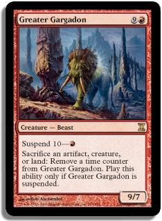 Suspend 10-R Sacrifice an artifact, creature, or land: Remove a time counter from Greater Gargadon. Play this ability only if Greater Gargadon is suspended.