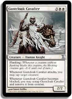 Flanking (Whenever a creature without flanking blocks this creature, the blocking creature gets -1/-1 until end of turn.) Whenever Gustcloak Cavalier attacks, you may tap target creature. Whenever Gustcloak Cavalier becomes blocked, you may untap Gustcloak Cavalier and remove it from combat.