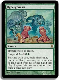 Hypergenesis is green. Suspend 3-1GG Starting with you, each player may put an artifact, creature, enchantment, or land card from his or her hand into play. Repeat this process until no one puts a card into play.
