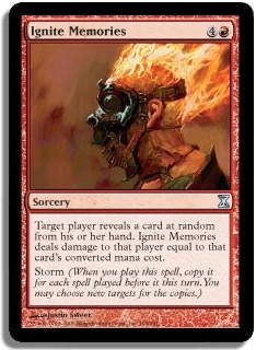 Target player reveals a card at random from his or her hand. Ignite Memories deals damage to that player equal to that card's converted mana cost. Storm (When you play this spell, copy it for each spell played before it this turn. You may choose new targets for the copies.)