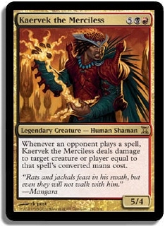 Whenever an opponent plays a spell, Kaervek the Merciless deals damage to target creature or player equal to that spell's converted mana cost.