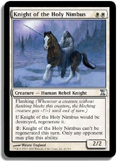 Flanking (Whenever a creature without flanking blocks this creature, the blocking creature gets -1/-1 until end of turn.) If Knight of the Holy Nimbus would be destroyed, regenerate it. 2: Knight of the Holy Nimbus can't be regenerated this turn. Only any opponent may play this ability.