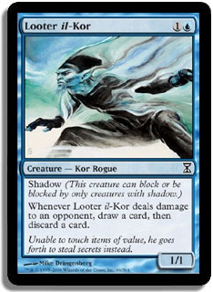 Shadow (This creature can block or be blocked by only creatures with shadow.) Whenever Looter il-Kor deals damage to an opponent, draw a card, then discard a card.