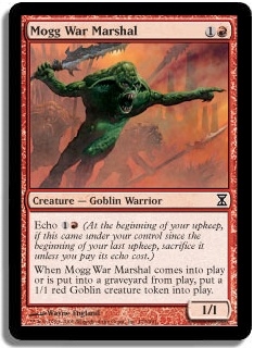 Echo 1R (At the beginning of your upkeep, if this came under your control since the beginning of your last upkeep, sacrifice it unless you pay its echo cost.) When Mogg War Marshal comes into play or is put into a graveyard from play, put a 1/1 red Goblin creature token into play.