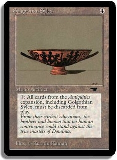 <1>: All cards from the _Antiquities_ expansion, including Golgothian Sylex, must be discarded from play.