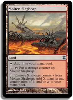 T Add 1 to your mana pool. 1, T Put a storage counter on Molten Slagheap. 1, Remove X storage counters from Molten Slagheap: Add X mana in any combination of B and/or R to your mana pool.