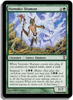 When Nantuko Shaman comes into play, if you control no tapped lands, draw a card. Suspend 1-2GG (Rather than play this card from your hand, you may pay 2GG and remove it from the game with a time counter on it. At the beginning of your upkeep, remove a time counter. When the last is removed, play it without paying its mana cost. It has haste.)