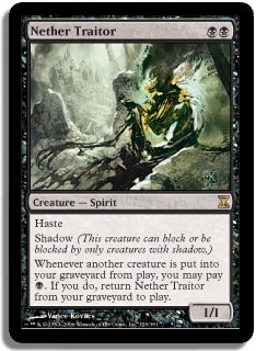 Haste Shadow (This creature can block or be blocked by only creatures with shadow.) Whenever another creature is put into your graveyard from play, you may pay B. If you do, return Nether Traitor from your graveyard to play.
