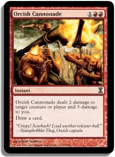Orcish Cannonade deals 2 damage to target creature or player and 3 damage to you. Draw a card.