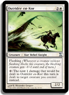 Flanking (Whenever a creature without flanking blocks this creature, the blocking creature gets -1/-1 until end of turn.) 0: The next 1 damage that would be dealt to Outrider en-Kor this turn is dealt to target creature you control instead.