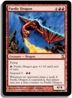 Flying R: Pardic Dragon gets +1/+0 until end of turn. Suspend 2-RR Whenever an opponent plays a spell, if Pardic Dragon is suspended, that player may put a time counter on Pardic Dragon.