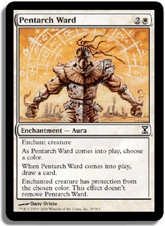 Enchant creature As Pentarch Ward comes into play, choose a color. When Pentarch Ward comes into play, draw a card. Enchanted creature has protection from the chosen color. This effect doesn't remove Pentarch Ward.