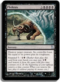 Destroy target creature. Its controller loses life equal to its power plus its toughness. Suspend 5-1B (Rather than play this card from your hand, you may pay 1B and remove it from the game with five time counters on it. At the beginning of your upkeep, remove a time counter. When the last is removed, play it without paying its mana cost.)