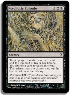 Target player reveals his or her hand and the top card of his or her library. You choose a card revealed this way. That player puts the chosen card on the bottom of his or her library. Madness 1B (If you discard this card, you may play it for its madness cost instead of putting it into your graveyard.)