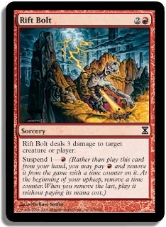 Rift Bolt deals 3 damage to target creature or player. Suspend 1-R (Rather than play this card from your hand, you may pay R and remove it from the game with a time counter on it. At the beginning of your upkeep, remove a time counter. When the last is removed, play it without paying its mana cost.)