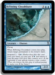 Flying When Riftwing Cloudskate comes into play, return target permanent to its owner's hand. Suspend 3-1U (Rather than play this card from your hand, you may pay 1U and remove it from the game with three time counters on it. At the beginning of your upkeep, remove a time counter. When the last is removed, play it without paying its mana cost. It has haste.)