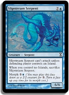 Slipstream Serpent can't attack unless defending player controls an Island. When you control no Islands, sacrifice Slipstream Serpent. Morph 5U (You may play this face down as a 2/2 creature for 3. Turn it face up any time for its morph cost.)