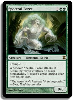 Trample Whenever Spectral Force attacks, if defending player controls no black permanents, it doesn't untap during your next untap step.