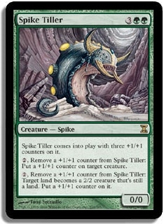 Spike Tiller comes into play with three +1/+1 counters on it. 2, Remove a +1/+1 counter from Spike Tiller: Put a +1/+1 counter on target creature. 2, Remove a +1/+1 counter from Spike Tiller: Target land becomes a 2/2 creature that's still a land. Put a +1/+1 counter on it.