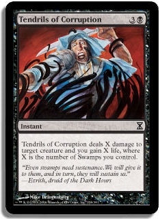 Tendrils of Corruption deals X damage to target creature and you gain X life, where X is the number of Swamps you control.