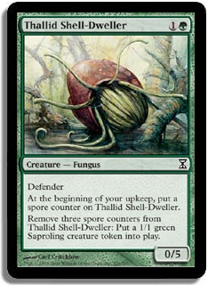 Defender At the beginning of your upkeep, put a spore counter on Thallid Shell-Dweller. Remove three spore counters from Thallid Shell-Dweller: Put a 1/1 green Saproling creature token into play.