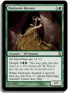 All Saprolings get +1/+1. Morph 3GG (You may play this face down as a 2/2 creature for 3. Turn it face up any time for its morph cost.) When Thelonite Hermit is turned face up, put four 1/1 green Saproling creature tokens into play.