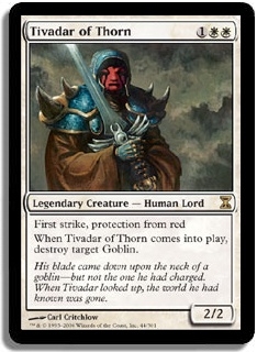 First strike, protection from red When Tivadar of Thorn comes into play, destroy target Goblin.
