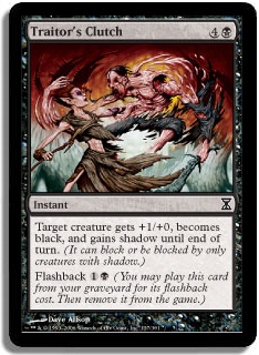 Target creature gets +1/+0, becomes black, and gains shadow until end of turn. (It can block or be blocked by only creatures with shadow.) Flashback 1B (You may play this card from your graveyard for its flashback cost. Then remove it from the game.)