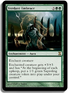 Enchant creature Enchanted creature gets +3/+3 and has "At the beginning of each upkeep, put a 1/1 green Saproling creature token into play under your control."