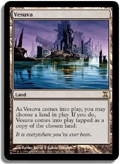 As Vesuva comes into play, you may choose a land in play. If you do, Vesuva comes into play tapped as a copy of the chosen land.