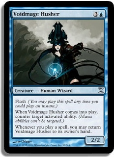Flash (You may play this spell any time you could play an instant.) When Voidmage Husher comes into play, counter target activated ability. (Mana abilities can't be targeted.) Whenever you play a spell, you may return Voidmage Husher to its owner's hand.
