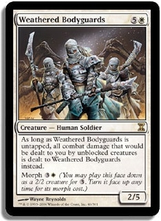 As long as Weathered Bodyguards is untapped, all combat damage that would be dealt to you by unblocked creatures is dealt to Weathered Bodyguards instead. Morph 3W (You may play this face down as a 2/2 creature for 3. Turn it face up any time for its morph cost.)