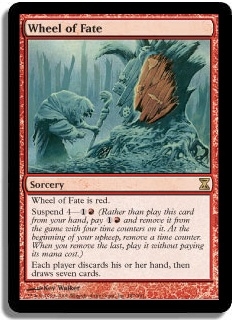 Wheel of Fate is red. Suspend 4-1R (Rather than play this card from your hand, pay 1R and remove it from the game with four time counters on it. At the beginning of your upkeep, remove a time counter. When the last is removed, play it without paying its mana cost.) Each player discards his or her hand, then draws seven cards.
