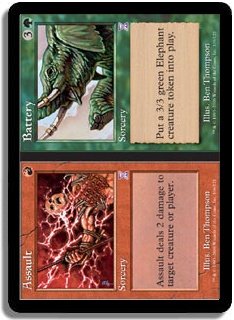 Assault deals 2 damage to target creature or player. // Battery 3G Sorcery Put a 3/3 green Elephant creature token into play.