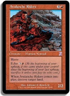 Haste Echo 3R (At the beginning of your upkeep, if this came under your control since the beginning of your last upkeep, sacrifice it unless you pay its echo cost.) When Avalanche Riders comes into play, destroy target land.