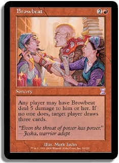 Any player may have Browbeat deal 5 damage to him or her. If no one does, target player draws three cards.