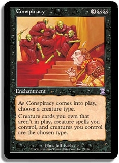 As Conspiracy comes into play, choose a creature type. Creature cards you own that aren't in play, creature spells you control, and creatures you control are the chosen type.