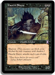 Shadow (This creature can block or be blocked by only creatures with shadow.) Dauthi Slayer attacks each turn if able.