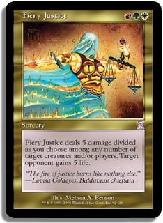 Fiery Justice deals 5 damage divided as you choose among any number of target creatures and/or players. Target opponent gains 5 life.
