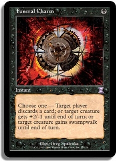 Choose one - Target player discards a card; or target creature gets +2/-1 until end of turn; or target creature gains swampwalk until end of turn.