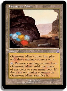 Gemstone Mine comes into play with three mining counters on it. T, Remove a mining counter from Gemstone Mine: Add one mana of any color to your mana pool. If there are no mining counters on Gemstone Mine, sacrifice it.