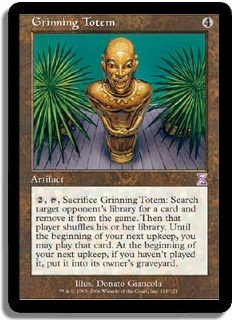 2, T, Sacrifice Grinning Totem: Search target opponent's library for a card and remove it from the game. Then that player shuffles his or her library. Until the beginning of your next upkeep, you may play that card. At the beginning of your next upkeep, if you haven't played it, put it into its owner's graveyard.