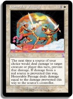 The next time a source of your choice would deal damage to target creature or player this turn, prevent that damage. If damage from a red source is prevented this way, Honorable Passage deals damage equal to the damage prevented this way to the source's controller.